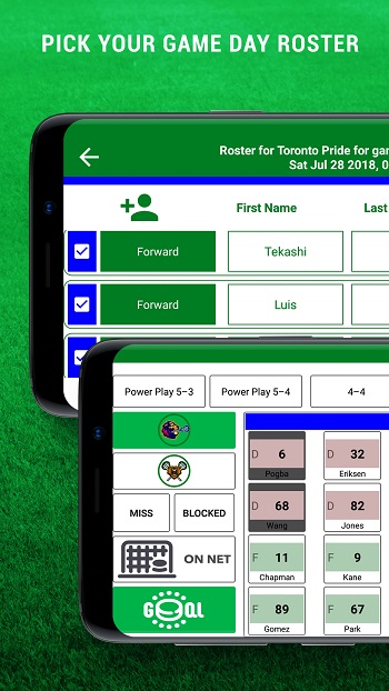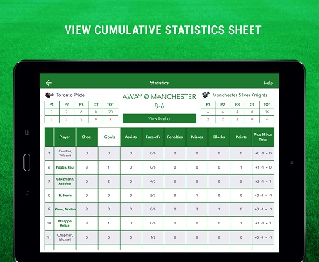 Game statistics include: * Goals / Assists * Shots / Misses * Blocked shots * Face-offs * Penalties * Goalie Stats